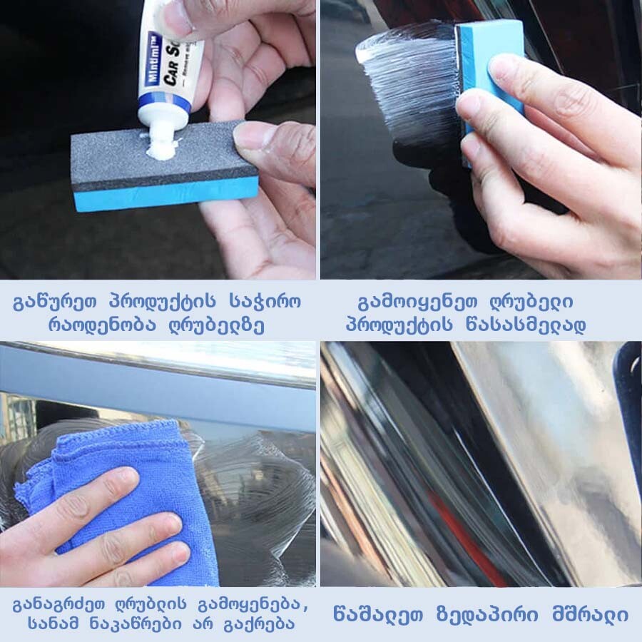 ძალიან კარგი პასტა ნაკაწრების მოსაშორებლად ხელით, პოლირებადი მანქანის გარეშე. ყველას ვურჩევ, მიაწვეთეთ სუფთა ზედაპირზე და მაშინვე დაიწყეთ შეზელვა, სანამ არ გაშრება, რაუნდური და გვერდითი მოძრაობებით. შემდეგ გაწმინდეთ რბილი ქსოვილით. გარშემო გარემოს ტემპერატურა უნდა იყოს 10 გრადუსზე მაღლა.